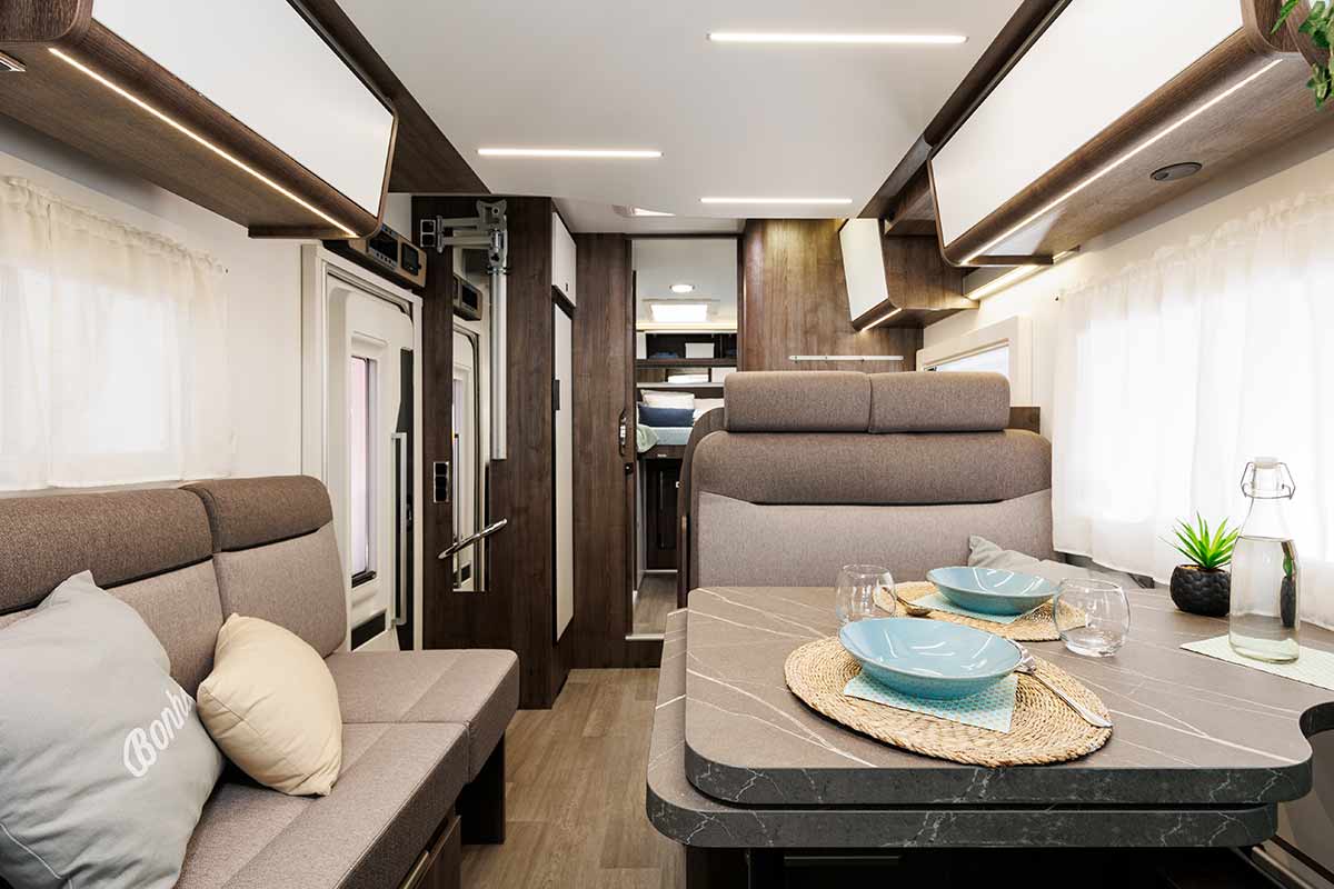 El interior de la autocaravana perfilada más vendida en 2025 apuesta por un diseño sobrio, con acabados Pamplona + Warm Grey. Iluminación LED en altillos y zonas principales.