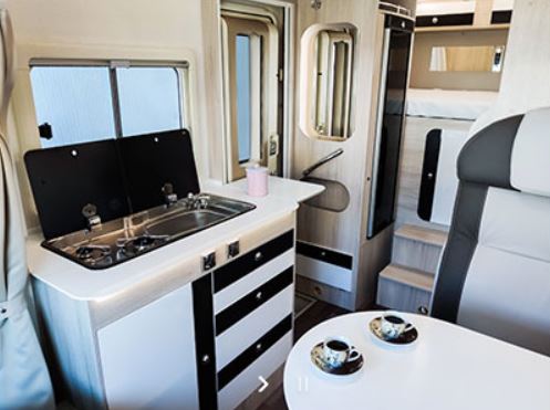 El interior del habitáculo es un espacio simple pero muy práctico donde encontramos el clásico comedor con banco, acompañado de una cómoda y completa cocina cargada de espacio de almacenamiento además del espacio reservado a los quemadores y al fregadero. Este bloque cocina trae consigo un frigorífico amplio con hasta 100 L de capacidad.