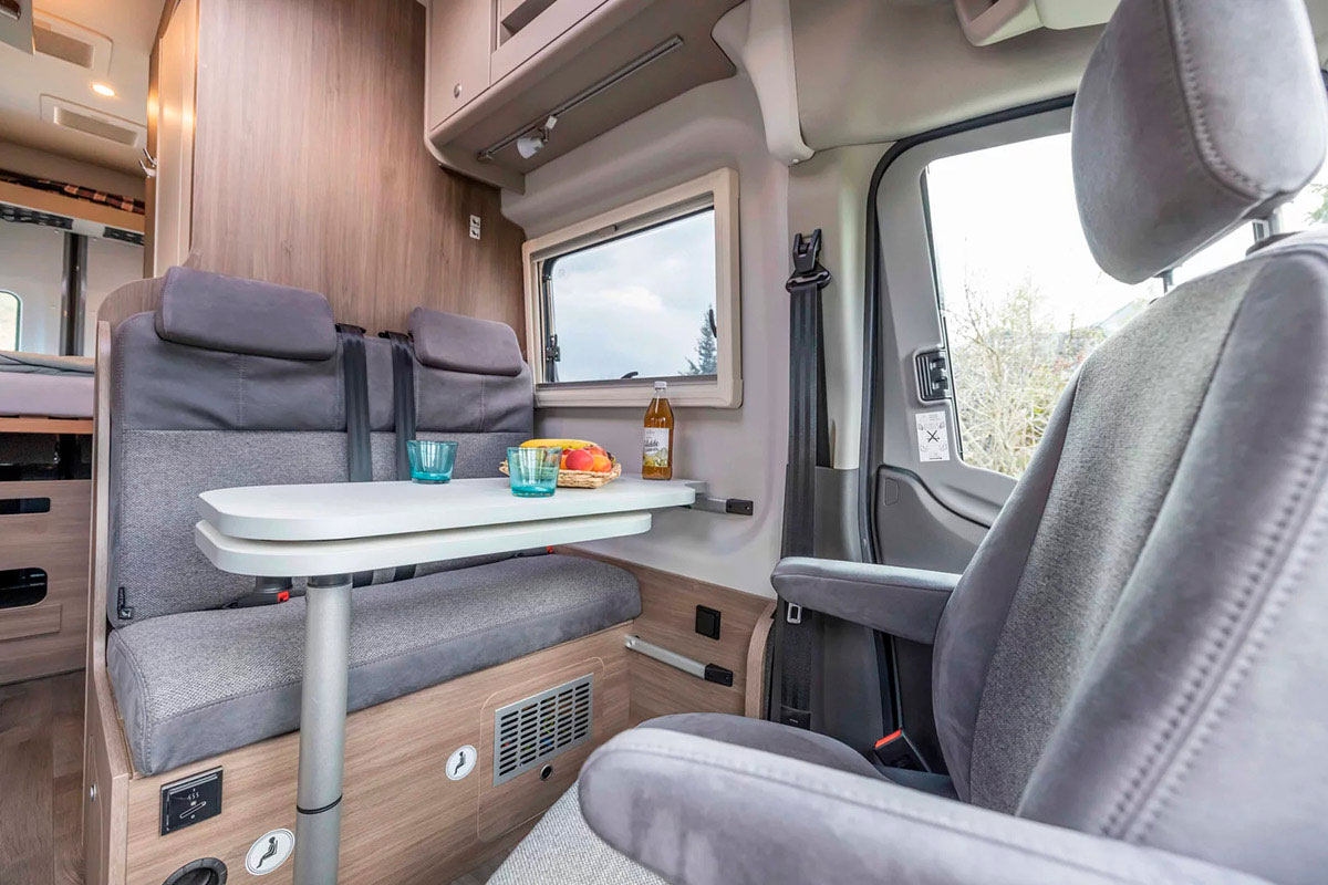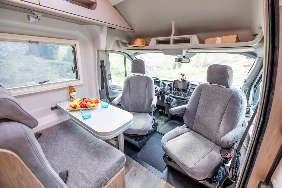 La dinette tiene un banco doble en el sentido de la marcha y los asientos giratorios de cabina, con la habitual mesa deslizable.