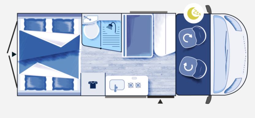 Si algo destaca de la Challenger V114 max es su capacidad y espacio para cuando cae la noche, ya que alberga camas para hasta 5 personas. Ubicándose dos camas de matrimonio en la parte trasera y una en el salón comedor convertible de la parte delantera. Las 3 camas, se esconden durante la ruta o para cuando no las necesitemos.