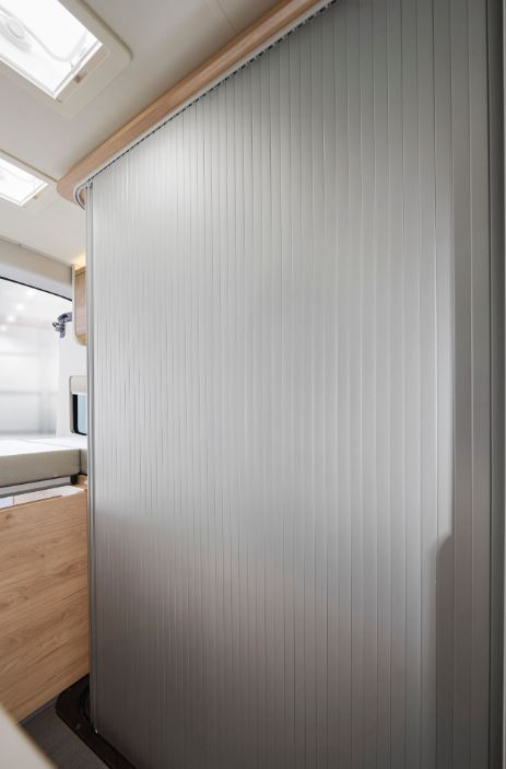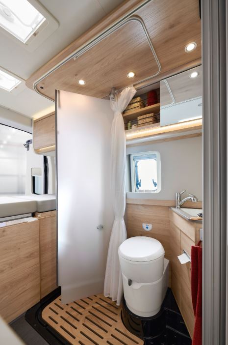 Aprovechando la construcción modular y abatible de la cama tranversal de la parte trasera, Dethleffs incorpora una puerta enrollable que permite que cuando no se utilice la ducha, pueda cerrarse, proporcionando mayor espacio al pasillo y al dormitorio. Además, el plato de ducha es inusualmente grande (87 cm de ancho x 47 centímetros de profundidad), sin restar espacio al lavamanos ni al inodoro.