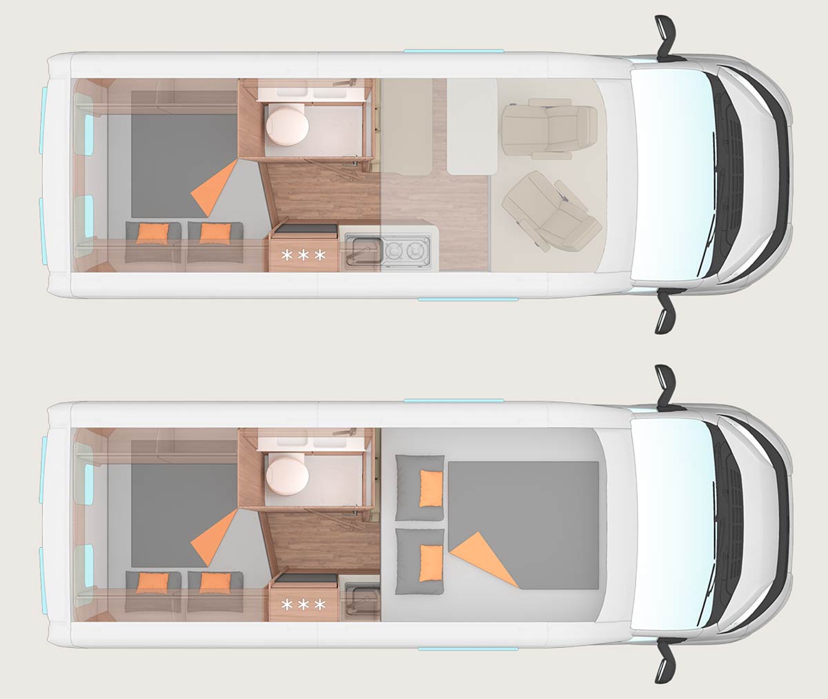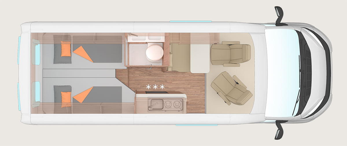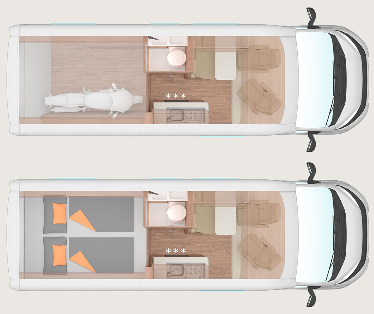 Las camper 540 MQ y la 600 MQ cuentan con 258 cm de altura. La 600 ME, también con 258 cm, dispone de camas gemelas longitudinales traseras. En cambio la 600 DQ, con 282 cm de altura, ofrece cama doble transversal trasera y cama doble elevable delantera; mientras que la 600 MQH, con 312 cm, mantiene la cama transversal trasera y suma igualmente una cama doble elevable en la parte delantera. En el caso del modelo 630 ME, con 258 cm de altura, incorpora camas gemelas longitudinales traseras y una cama individual delantera.