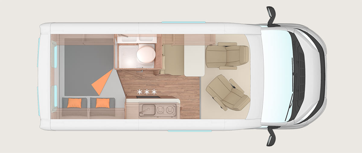 De serie, la dotación de la CaraBus Grey EDITION es especialmente completa: cámara de marcha atrás, centro multimedia, tomas USB y enchufes de 230 V para mayor comodidad en el día a día. También incluye toldo y preinstalación para panel solar y antena satelital. El techo tipo sándwich asegura un aislamiento eficiente, mejorando el confort térmico y contribuyendo al ahorro energético.