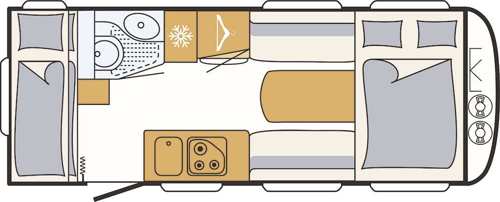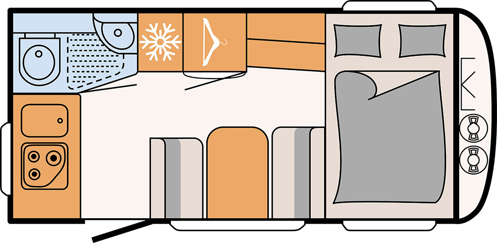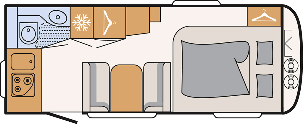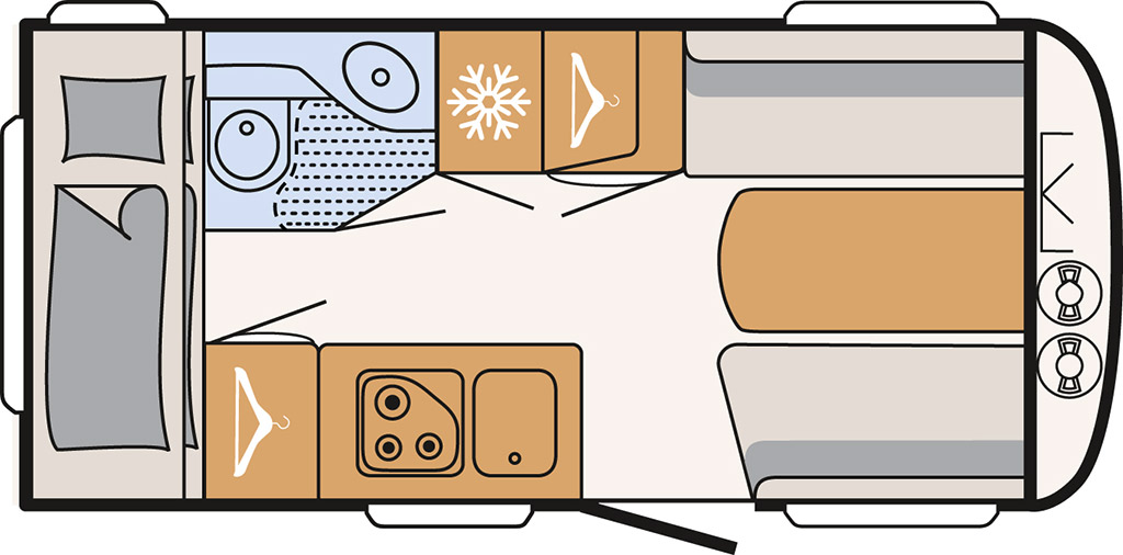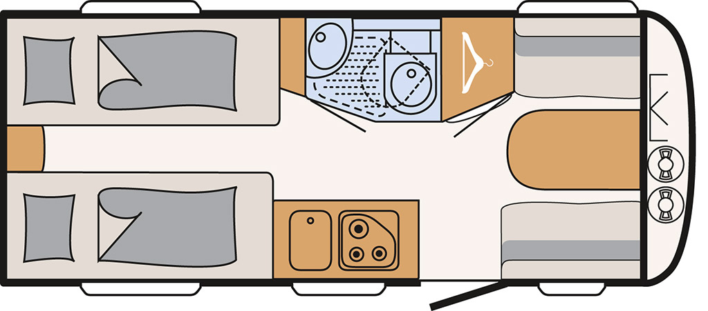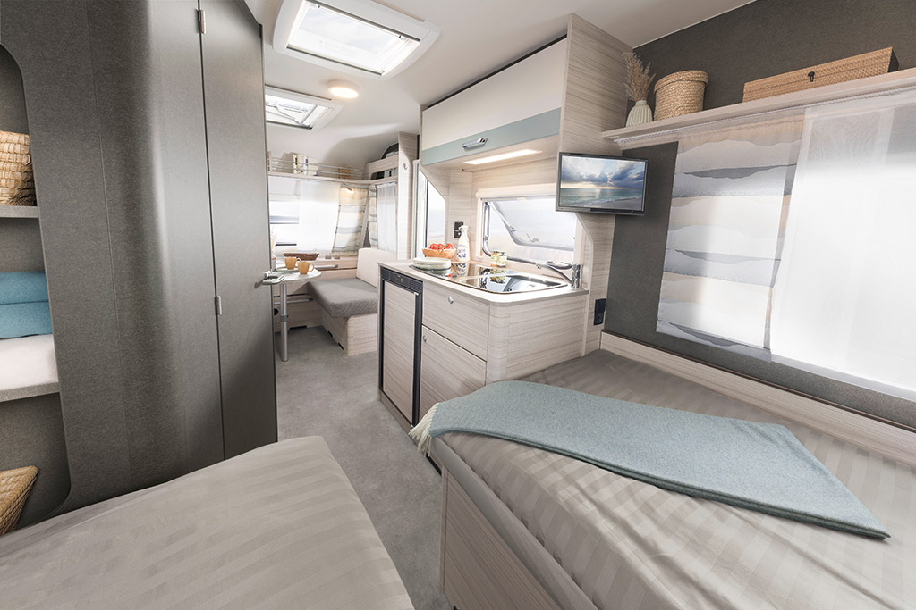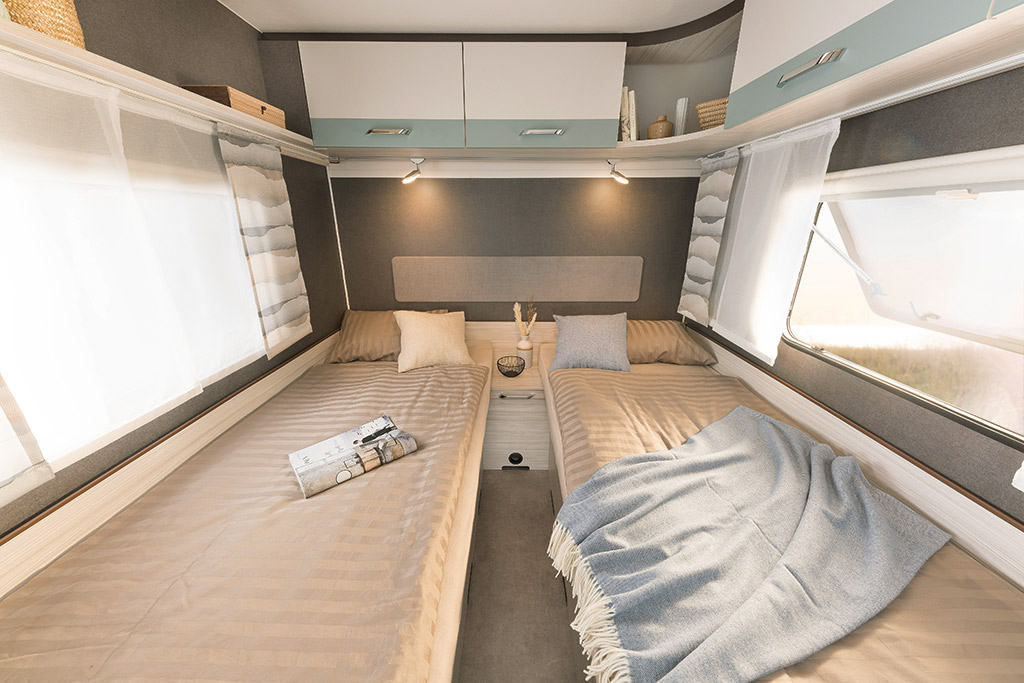 460 LE con salón delantero y camas gemelas traseras.
