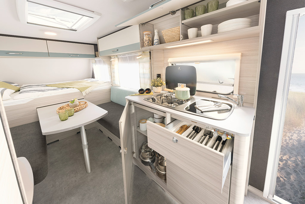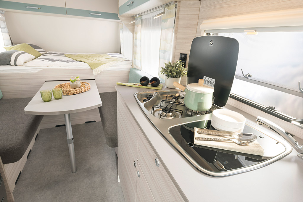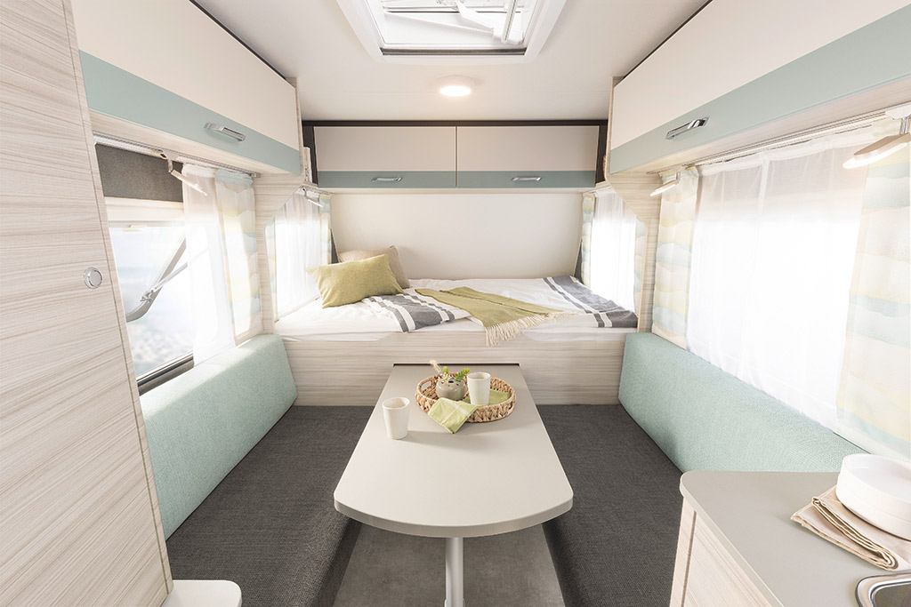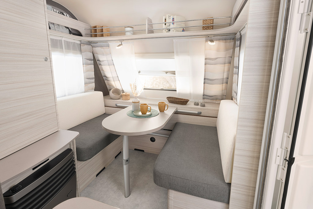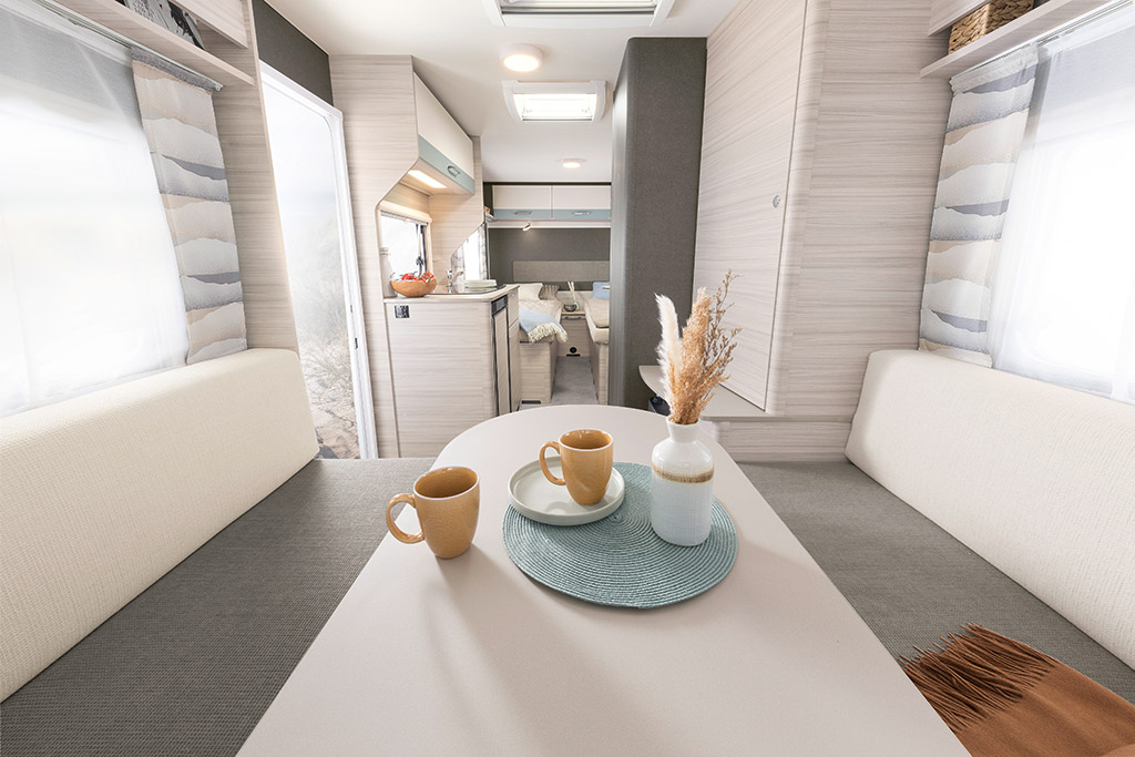 Para la temporada 2023 Dethleffs ha renovado todos los modelos. El mobiliario es de color claro, veteado horizontalmente para transmitir sensación de amplitud. Los armarios altos tienen unas franjas decorativas a juego con las tapicerías. Hay dos opciones de tapicerías disponibles: Kappan, en gris y beige, y Timor con los respaldos turquesa y los asientos antracita.