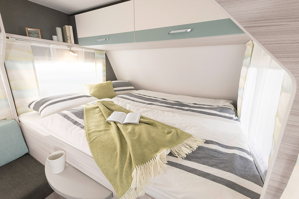 El modelo c’joy 480 QLK tiene la cama doble transversal delantera, salón enfrentado central y literas transversales superpuestas traseras.