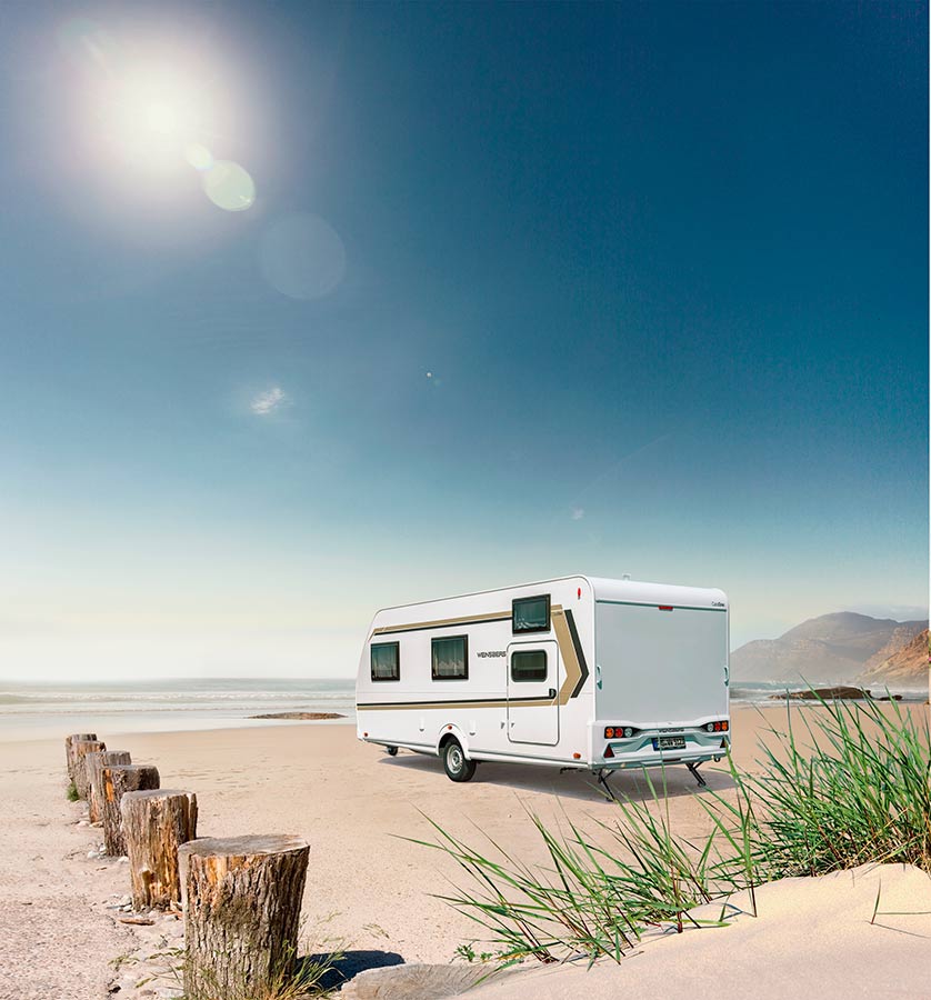 La parte exterior de las caravanas CaraOne también recibe modificaciones. Las paredes laterales lisas en blanco se combinan con adhesivos específicos y, en versiones de un eje, con llantas de aleación ligera. La cubierta para la lanza de enganche suma coherencia a un diseño que refuerza el carácter actual del modelo.