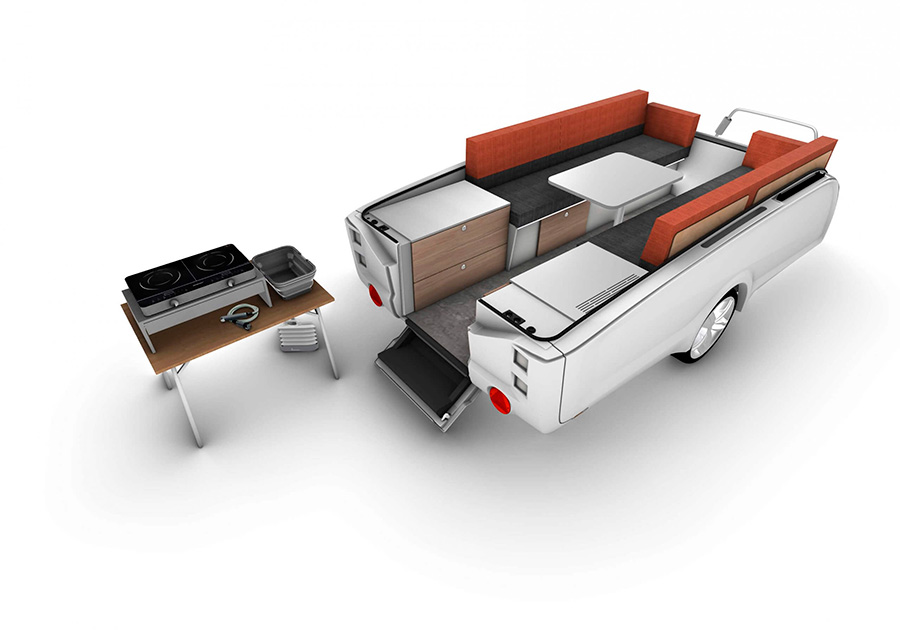 El remolque, que acaparó todas las miradas, presentaba una nueva distribución interior donde destaca el nuevo diseño de la cama semifija de 205×160 cm. El remolque, una vez esté montando, tiene unas dimensiones de 2,52 m de alto, 2,91 m de largo y 1,60 de ancho.