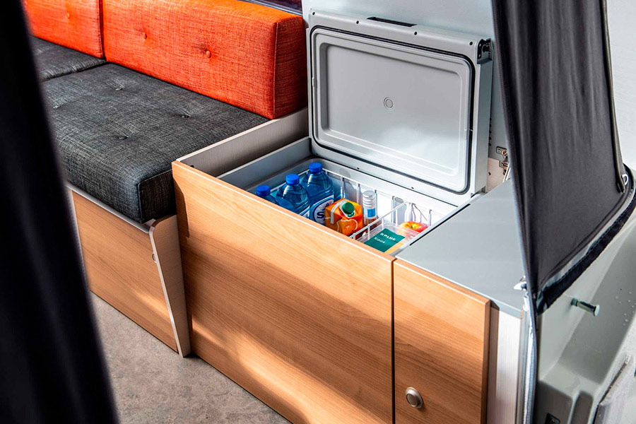 En la parte de entrada, a la derecha, está ubicada la nevera. La marca, con sede en Utrecht, brinda la oportunidad de poder escoger entre nevera de absorción (gas, 230V, 12V) o una nevera-congelador de compresor (230V, 12V). A la izquierda, podremos guardar la cocina extraíble. Bajo ella, TAKE OFF incorpora múltiples armarios como solución de almacenaje.