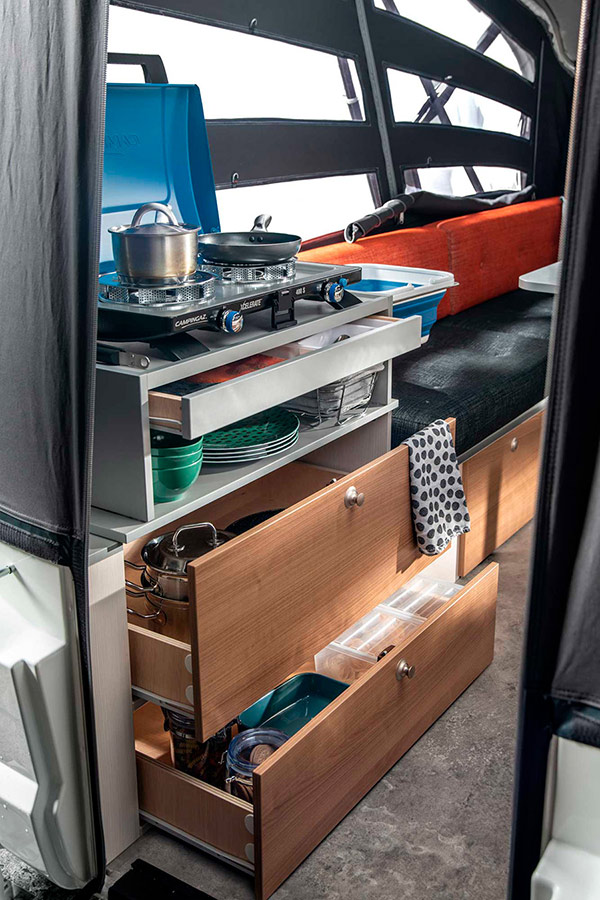TAKE OFF, el remolque caravana de Easycaravanning, ofrece una versión mejorada de su espacio interior llena de practicidad y soluciones inteligentes