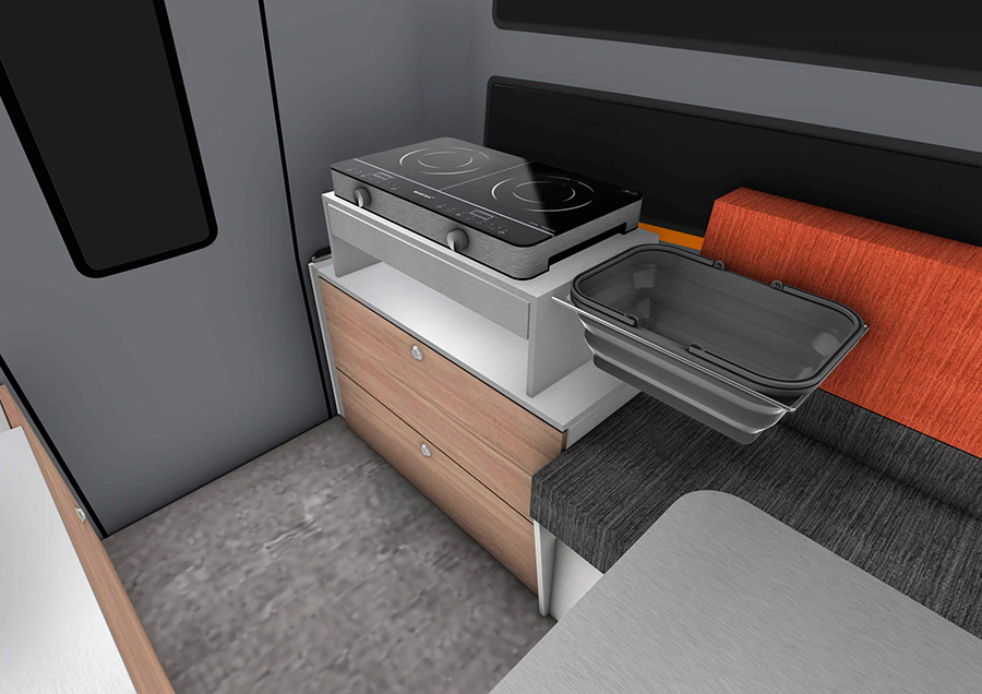 Además del salón dormitorio, el nuevo remolque caravana TAKE OFF incorpora todo lo necesario para la aventura en pareja. TAKE OFF cuenta con inodoro portátil de fácil acceso, ubicado en la puerta del armario del banco.